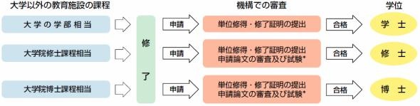 わが国の、大学以外の教育施設に置かれた課程(各省庁大学校)のうち、大学の学士課程、大学院の修士課程および博士課程に相当する水準の教育を行っていると機構が認定した課程の修了者に、学位取得の途を開いています。